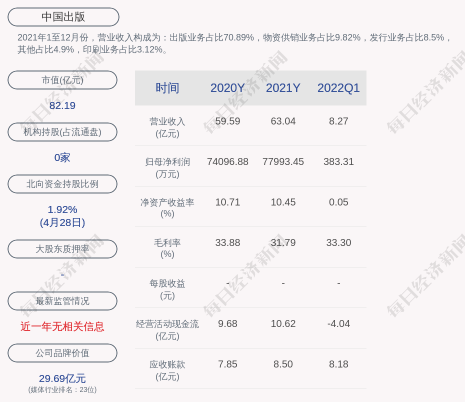 中国出版(SH 601949,收盘价:4.51元)4月29日晚间发布一季度业绩公告称,2022年第一季度营收约8.27亿元;归属于上市公司股东的净利润约383万元;基本每股收益0.0021元。