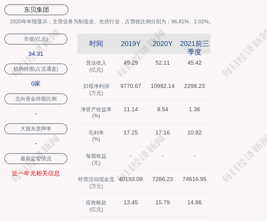 2020年年报显示,东贝集团的主营业务为制造业、光伏行业,占营收比例分别为:96.81%、1.02%。