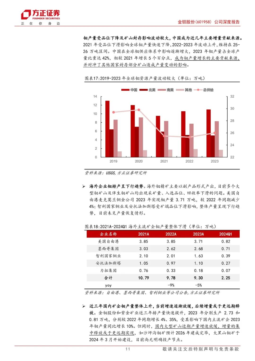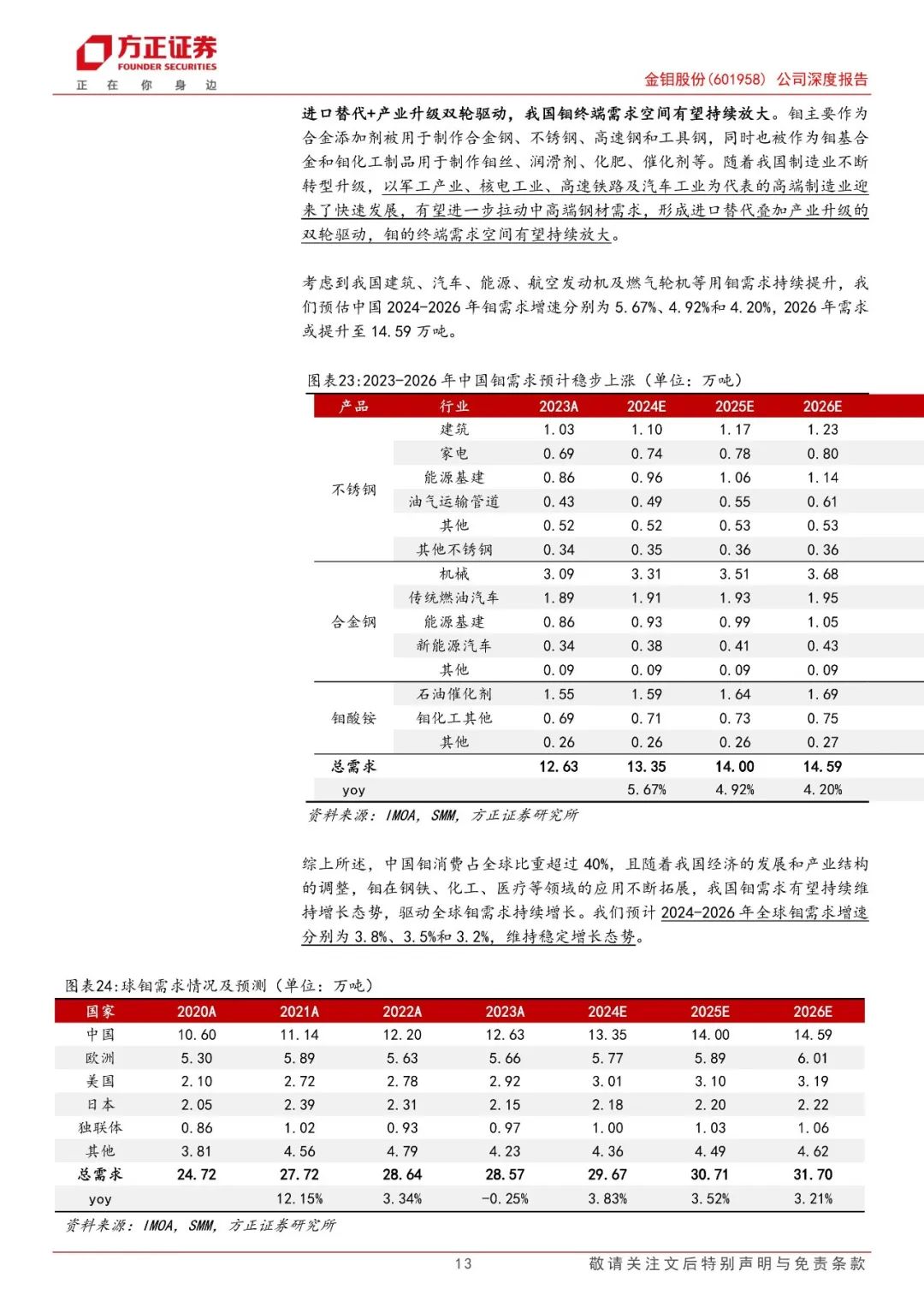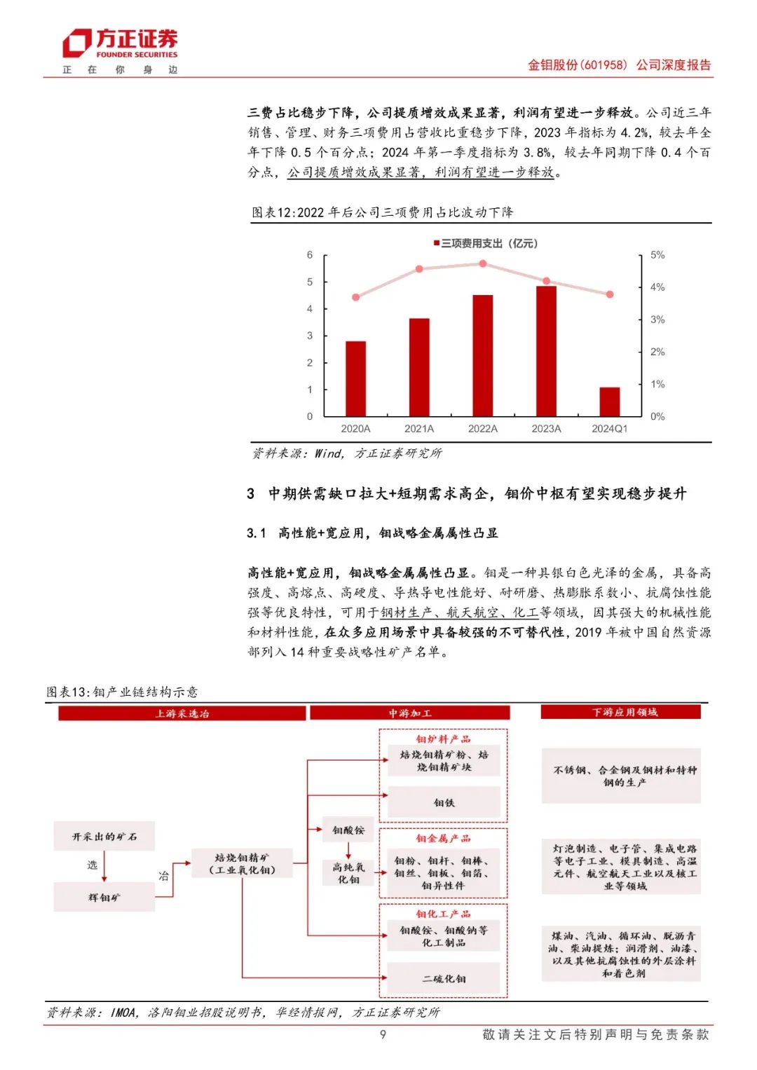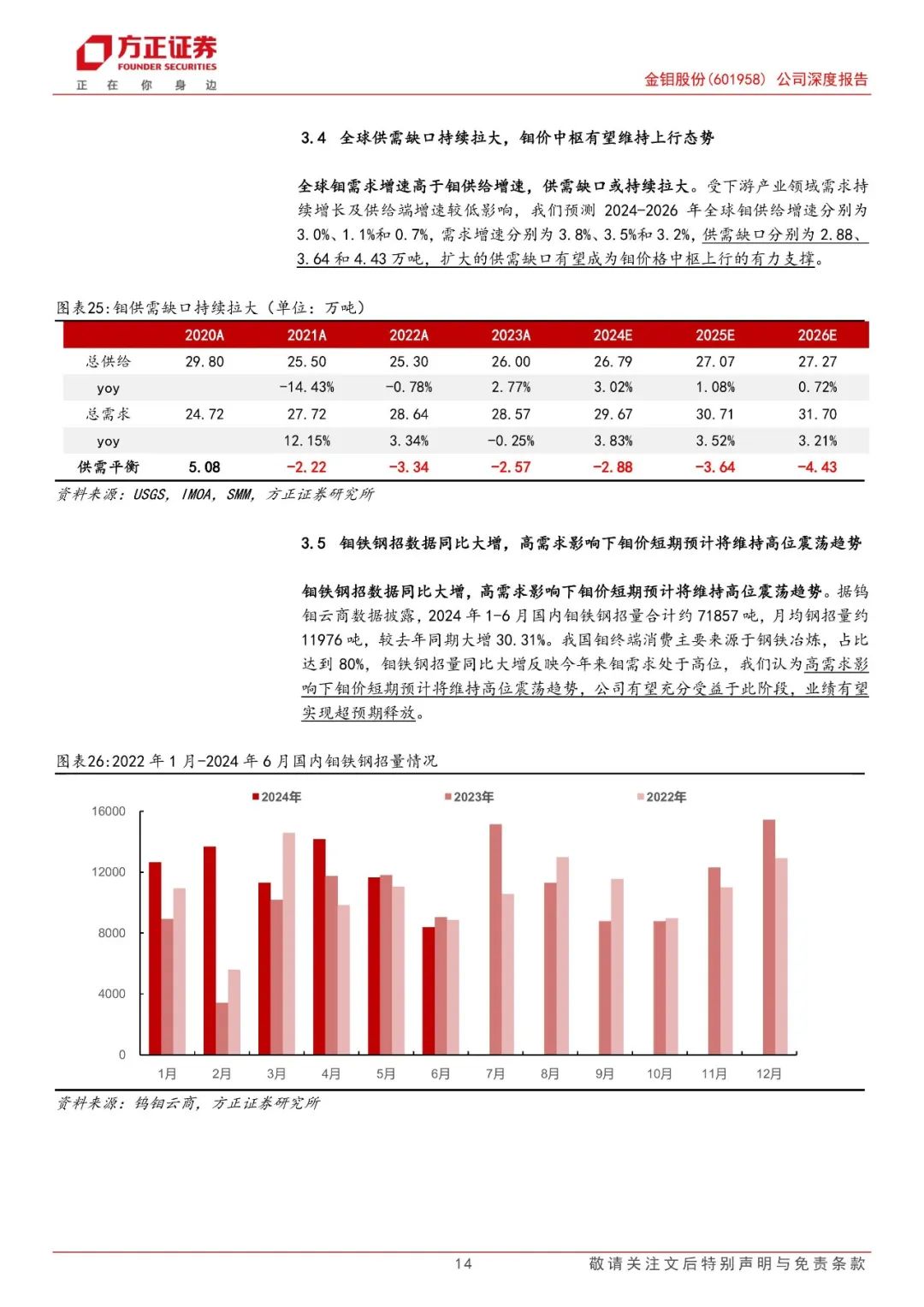 中期维度看,近三年供需缺口预计将持续扩大,驱动钼价中枢稳步抬升。供给端,国内受存量端企业扩产增速放缓、增量端主要中大型扩产项目投产节点延期影响,整体供应处于微幅增长态势,此外2024Q1主要海外企业钼矿产量整体呈下行趋势;需求端,中国钼消费占全球比重超过40%,我们认为伴随经济发展和产业结构调整,钼需求有望持续维持增长态势。在此测算下,预计未来三年产业供需缺口分别为2.88、3.64和4.43万吨,供需缺口持续拉大有望驱动钼价格中枢稳步提升。