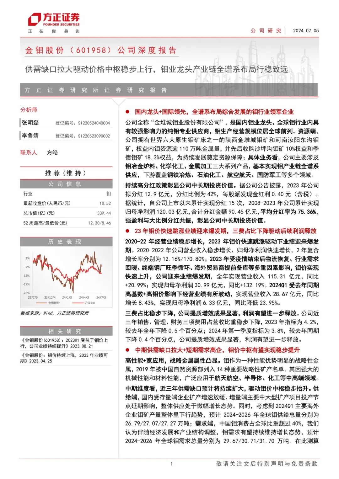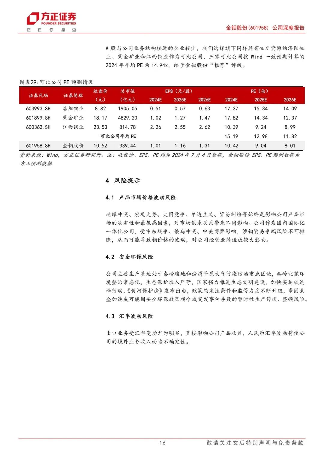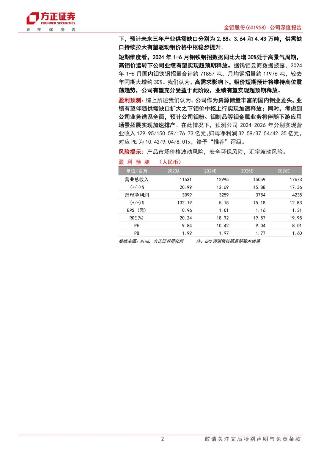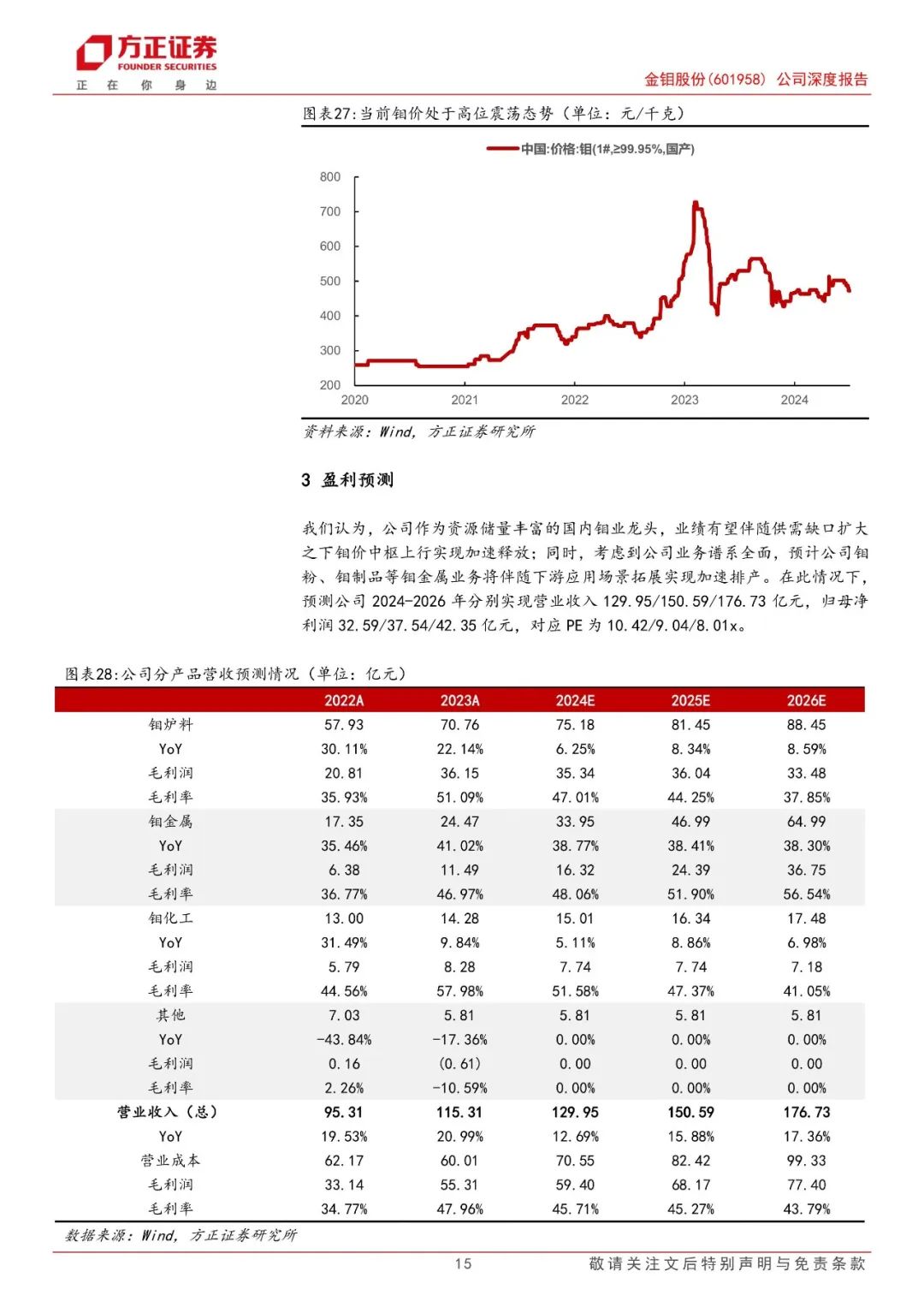 盈利预测:综上所述我们认为,公司作为资源储量丰富的国内钼业龙头,业绩有望伴随供需缺口扩大之下钼价中枢上行实现加速释放;同时,考虑到公司业务谱系全面,预计公司钼粉、钼制品等钼金属业务将伴随下游应用场景拓展实现加速排产。在此情况下,预测公司2024-2026年分别实现营业收入129.95/150.59/176.73亿元,归母净利润32.59/37.54/42.35亿元,对应PE为10.42/9.04/8.01x,给予“推荐”评级。