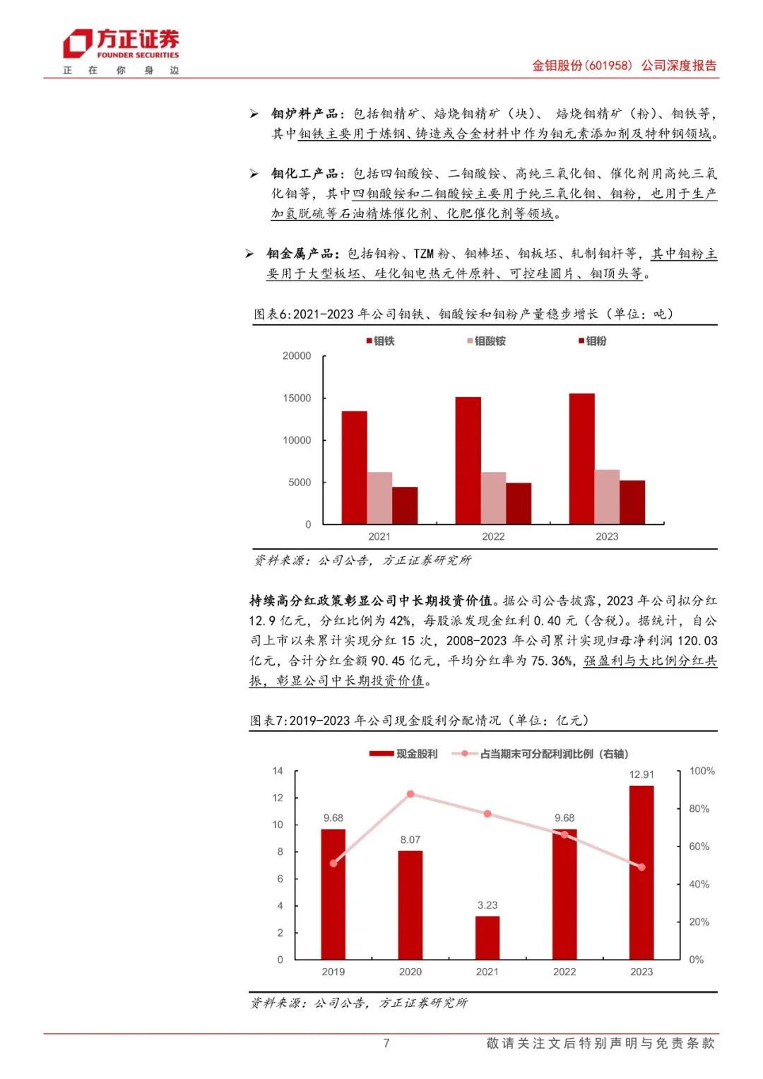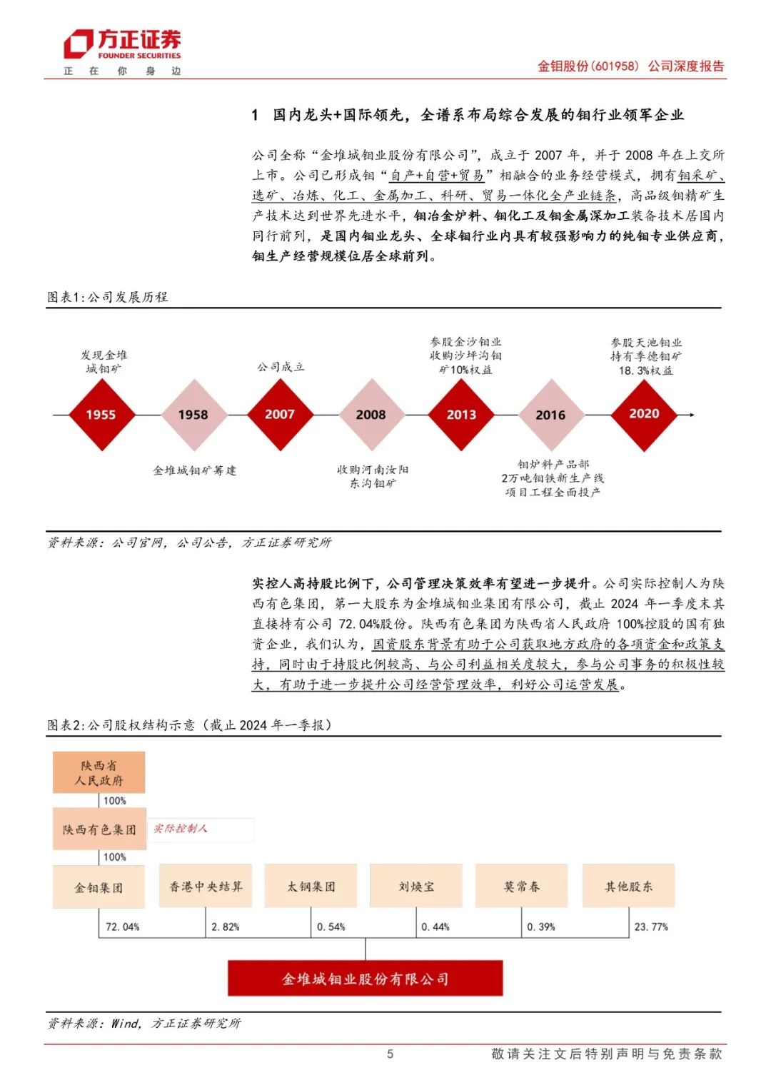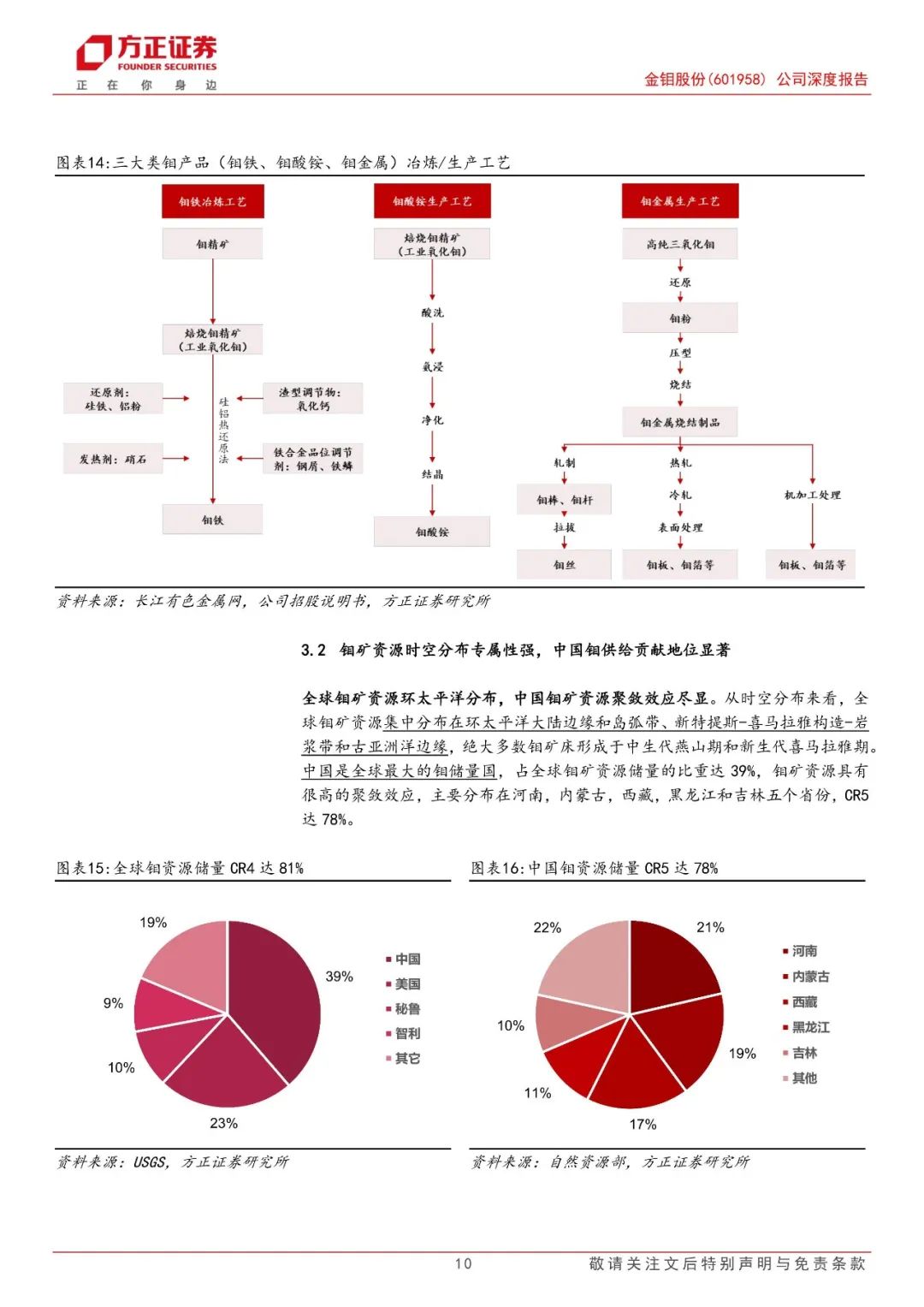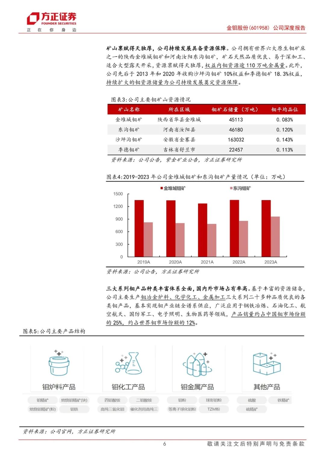 公司全称“金堆城钼业股份有限公司”,是国内钼业龙头、全球钼行业内具有较强影响力的纯钼专业供应商,钼生产经营规模位居全球前列。资源端,公司拥有世界六大原生钼矿床之一的陕西金堆城钼矿和河南汝阳东沟钼矿,权益内钼资源逾110万吨金属量,并先后收购沙坪沟钼矿10%权益和季德钼矿18.3%权益,为持续发展奠定资源保障;具体业务看,公司主要涉及钼冶金炉料、化学化工、金属加工三大系列产品,基本实现钼产业链全谱系供应,下游覆盖钢铁冶炼、石油化工、航空航天、国防军工等多个领域。