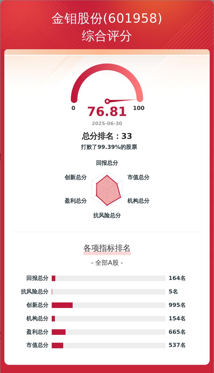 金融界上市公司研究院构建了一套上市公司韧性评价体系,从企业盈利、科技创新、股东回报、经营抗风险、市值表现及机构吸引力六个维度对企业进行量化评分,满分为100分。金钼股份的韧性评价总分为76.81分,在A股5405家可比上市公司中排名第33位。