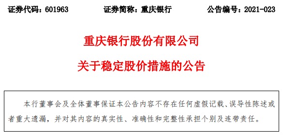 重庆银行于2021年8月5日召开第六届董事会第三十一次会议,以13票同意、0票反对、0票弃权审议通过了《关于启动A股稳定股价措施的议案》,由于商业银行特殊性,回购股份注销并减少注册资本方式不具备可行性,重庆银行董事会同意根据重庆银行《稳定股价预案》的实施顺序,由重庆银行现任领取薪酬的非独立董事、高级管理人员、第一大股东增持股份的措施稳定股价。