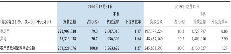 年报显示,截至2020年末,重庆银行在重庆地区的不良贷款金额为26.07亿元,年增50.87%;占不良贷款总额的比重由2019年的55.19%上升至73.16%。同期,不良贷款率上升了0.29个百分点至1.17%。