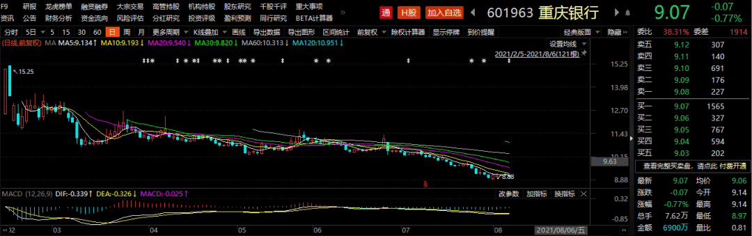 截至8月6日收盘,重庆银行收于每股9.07元,日跌0.77%,跌幅居今日银行板块第三位。重庆银行当前A股市值为315亿元,动态市盈率为7.03倍,市净率0.8倍。