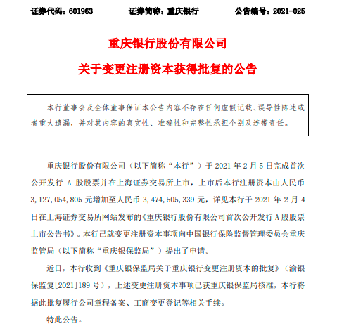 8月17日消息,重庆银行发布公告称,收到《重庆银保监局关于重庆银行变更注册资本的批复》(渝银保监复[2021]189 号),重庆银保监局同意重庆本行将注册资本由人民币31.27亿元变更为人民币34.75亿元。