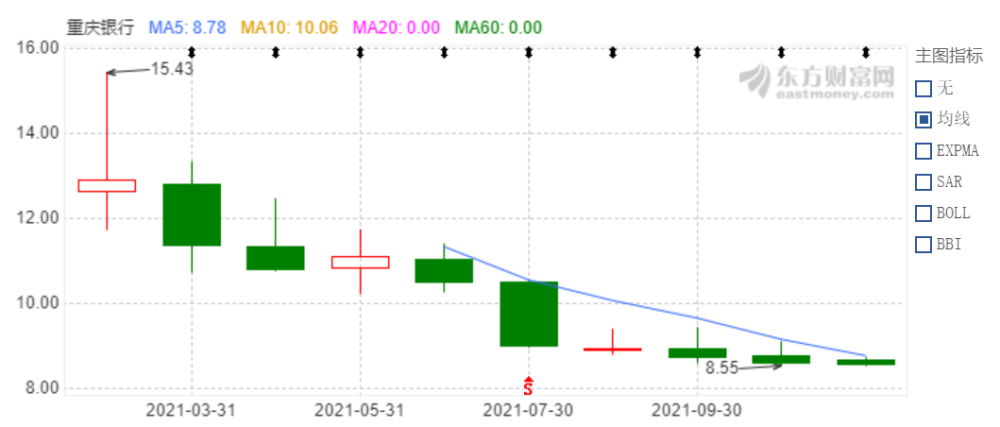 截至11月2日,重庆银行的A股股价报8.58元/股收盘,总市值298.1亿元。相较于上市发行价,已跌20.78%;较最高价已跌44.39%。