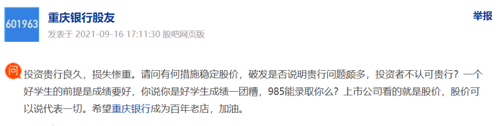 有的投资者还指出,投资重庆银行致其损失惨重。并且表示,破发是否说明贵行问题颇多,投资者不认可贵行?