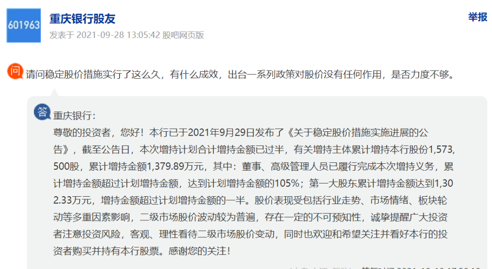 虽然重庆银行的稳定股价措施在实施过程中“偶”有效果,中间有小幅回升,但总体呈下降趋势,股价仍呈破发状态。对于这种情况,有投资者对重庆银行的稳定股价措施提出了质疑,质疑其力度是否不够。