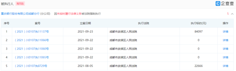 此外,信息显示,重庆银行分支行除了遭到银保监会的行政处罚之外,其分行重庆银行股份有限公司成都分行因未按时履行法律义务遭到成都市武侯区人民法院强制执行,执行次数为6次,被执行金额累计逾10万元。