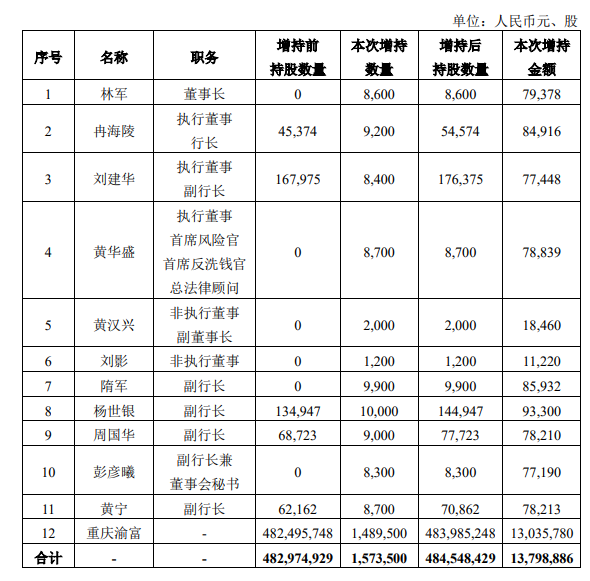 8月6日,重庆银行发布关于稳定股价措施的公告,需履行稳定股价义务的董事、高管共12人拟以集中竞价交易方式增持公司股份。