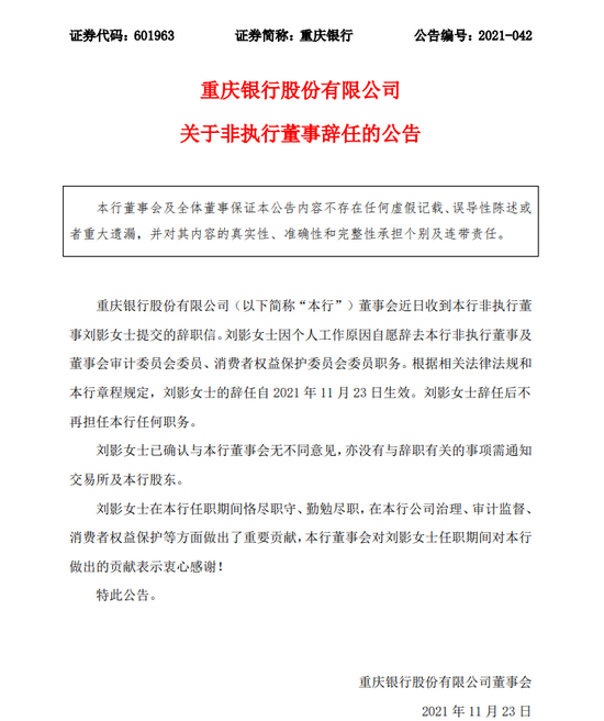 11月23日消息,重庆银行发布公告,公司董事会近日收到本行非执行董事刘影女士提交的辞职信。刘影女士因个人工作原因自愿辞去本行非执行董事及董事会审计委员会委员、消费者权益保护委员会委员职务。根据相关法律法规和本行章程规定,刘影女士的辞任自2021年11月23日生效。刘影女士辞任后不再担任本行任何职务。