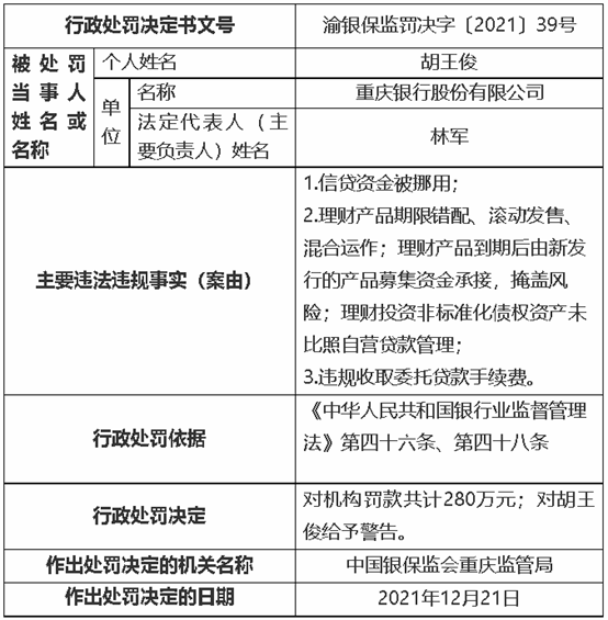根据其中一张罚单,因涉及3项违法违规事实,重庆银行被重庆银保监局罚款共计280万元,并对胡王俊个人给予了警告。3项违法违规事实依次为:1.信贷资金被挪用;2.理财产品期限错配、滚动发售、混合运作;理财产品到期后由新发行的产品募集资金承接,掩盖风险;理财投资非标准化债权资产未比照自营贷款管理;3.违规收取委托贷款手续费。