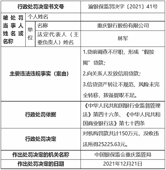 另一张罚单则显示,因涉3项违法违规事实,重庆银保监局对重庆银行罚款共计150万元,没收违法所得约2.52万元。3项违法违规事实依次为:1.贷前调查不尽职,形成“假按揭”贷款;2.向关系人发放信用贷款;3.信贷资产转让不规范,风险未完全转移,拨备提取不足。