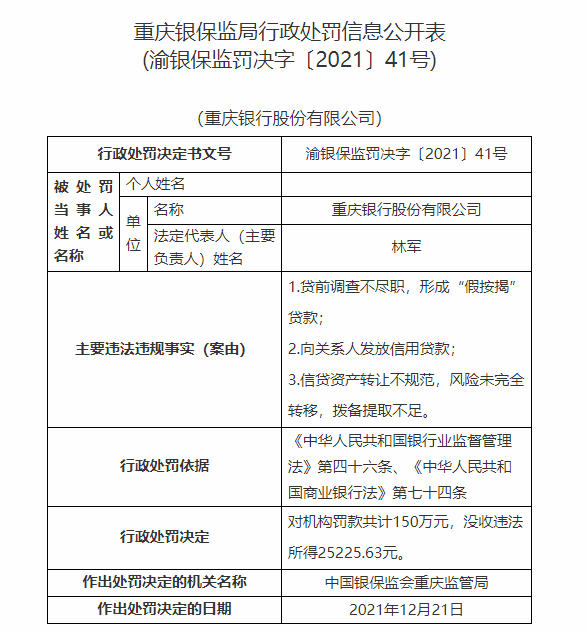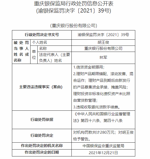 日前,重庆银行被重庆银保监局合计罚款430万元。