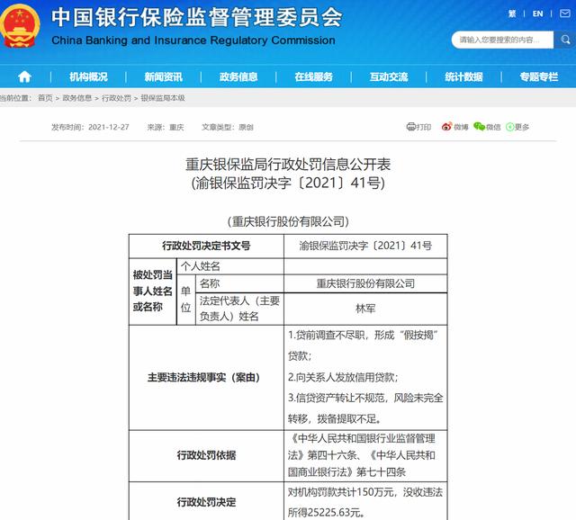 据记者梳理,这已经是重庆银行今年第3次因为贷款资金被挪用受罚。2021年3月4日,重庆银行巴南支行因“贷款三查严重不合规且贷款资金被担保公司挪用”被罚款20万元;2021年2月9日,重庆银行成都崇州支行因“贷前调查未尽职、贷后管理不到位,以致贷款资金被挪用,最终回流至存单出质方在崇州支行账户,虚增存款,严重违反审慎经营规则。”被罚款30万元。