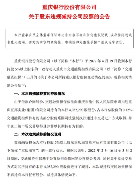 4月20日晚间,重庆银行发布关于股东违规减持公司股票的公告称,该行股东重庆市交通融资担保有限公司(下称“交通融资担保”)于2022年2月16日至3月2日期间通过集中竞价交易方式清仓减持其所持有的该行4052290股股份。
