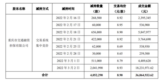 公告显示,2022年2月16日至3月2日期间,交通融资担保共有8次违规减持,交易均价为8.90元每股,合计成交金额约3606.49万元。