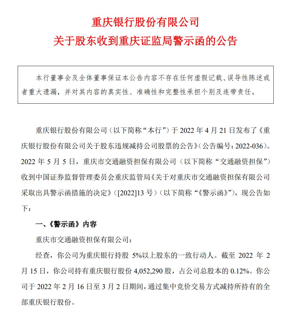 具体来看,重庆市交通融资担保有限公司为重庆银行持股5%以上股东的一致行动人。截至2022年2月15日,重庆交通融资担保持有重庆银行股份4052290股,占总股本的0.12%。重庆交通融资担保于2022年2月16日至3月2日期间,通过集中竞价交易方式减持所持有的全部重庆银行股份。