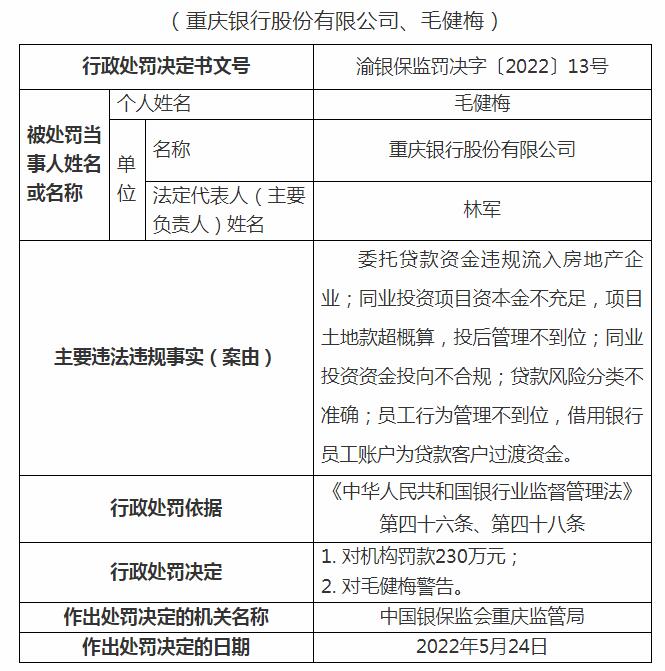 依据《中华人民共和国银行业监督管理法》第四十六条、第四十八条,重庆银保监局对重庆银行罚款230万元,当事人毛健梅被警告。