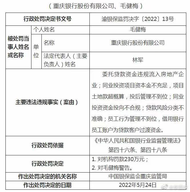 #重庆银行多项违法违规被处罚#据央广网消息,近日重庆银保监局开出罚单,针对委托贷款资金违规流入房地产企业等多项违法违规行为,对重庆银行罚款230万元,对责任人毛健梅进行警告。