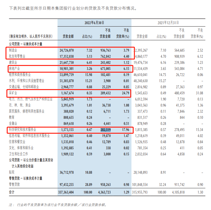 按行业划分来看,重庆银行的不良贷款主要集中在制造业、批发和零售业、房地产业、采矿业、科学研究和技术服务业,不良贷款金额分别为9.37亿元、7.63亿元、6.75亿元、2.89亿元、2.83亿元,不良贷款率分别为3.79%、4.40%、6.15%、24.79%、17.96%。