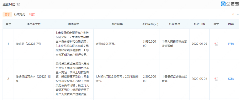 今年5月24日,重庆银行因存在委托贷款资金违规流入房地产企业;同业投资项目资本金不充足,项目土地款超概算,投后管理不到位;同业投资资金投向不合规;贷款风险分类不准确;员工行为管理不到位,借用银行员工账户为贷款客户过渡资金等行为,被处以230万元罚款,负责人毛某某被警告。