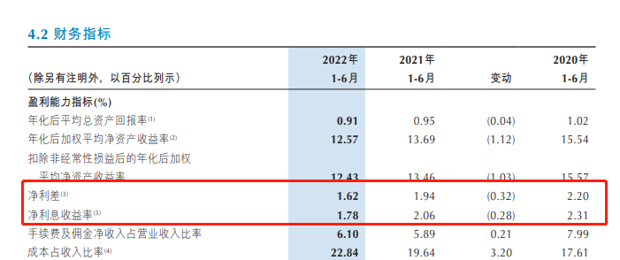 值得注意的是,重庆银行上半年生息资产收益率为4.55%,同比下降34个基点,计息负债平均付息率为2.93%,同比下降2个基点。这也导致重庆银行的净利差、净利息收益率均同比下滑,分别为1.62%、1.78%,同比分别下降32个基点、28个基点。