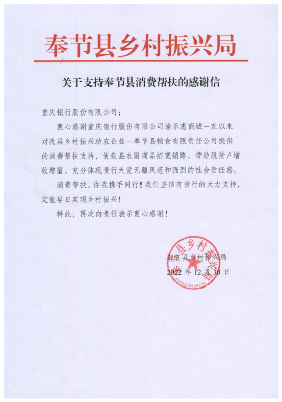 近日,奉节县乡村振兴局向我行发来感谢信,感谢我行“渝乐惠”商城对该县乡村振兴助农企业的支持,有效帮助该县农副产品拓宽销路,为带动脱贫户增收致富,贡献金融力量。这是自2021年我行收到酉阳县农业农村委员会感谢信后,再次收到的来自乡村振兴主管部门对我行消费帮扶工作的肯定。