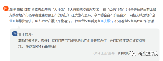 近期,有投资者在互动平台咨询重庆银行称,《关于做好当前金融支持房地产市场平稳健康发展工作的通知》发布后,多家银行积极支持房地产企业正常融资需求,助力房地产融资平稳运行。并询问重庆银行是否有相关动作。2月3日,重庆银行董秘回复表示“本行目前已与多家房地产企业开展合作,并已陆续实现信贷支持落地。”