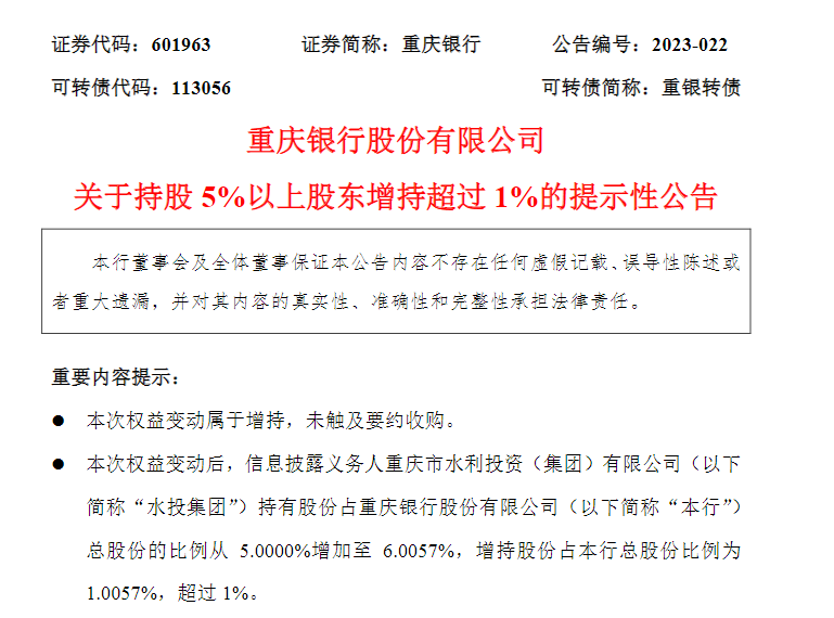 4月17日,重庆银行发布公告,重庆市水利投资(集团)有限公司(以下简称“水投集团”)于2023年2月11日至4月14日期间增持3494.48万股,持股比例从5%增加至6.0057%。