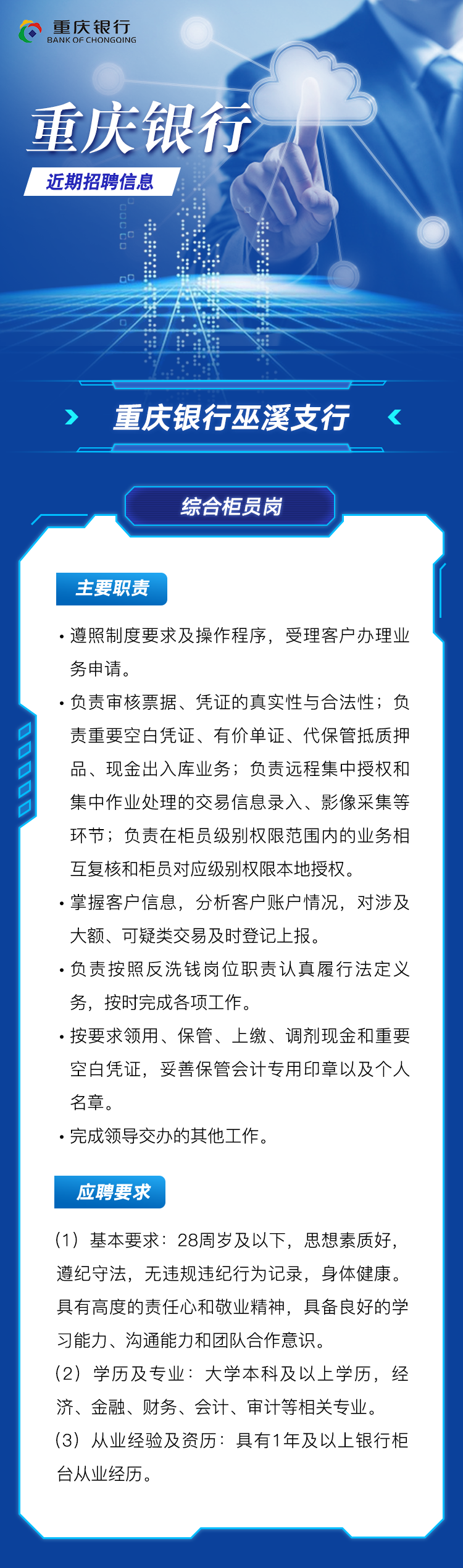 招贤纳士 | 重庆银行巫溪支行招聘啦!