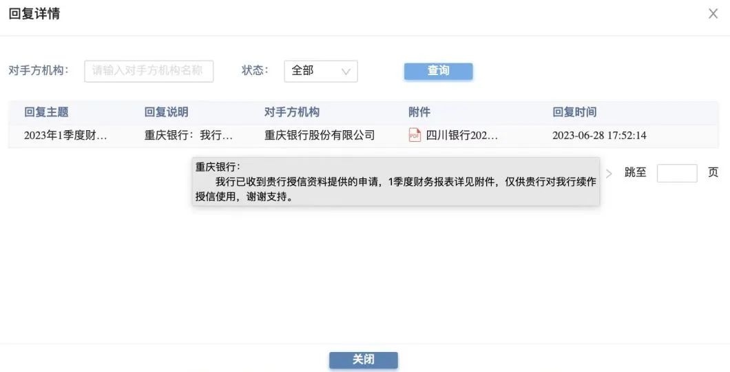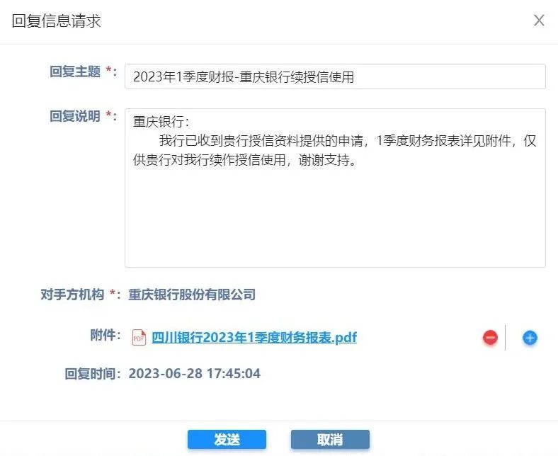 重庆银行通过机构汇信息请求板块向四川银行发送同业授信续作资料补充的需求。四川银行收到信息后,及时回复并附上1季度财务报表,充分利用机构汇平台快速、安全的特性发送授信相关资料。