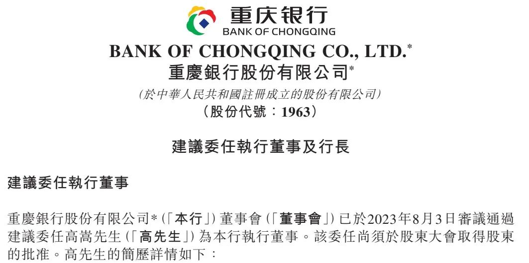 8月4日,重庆银行披露了一系列公告,其中包括执行董事、行长辞任,以及建议委任执行董事长及行长等。