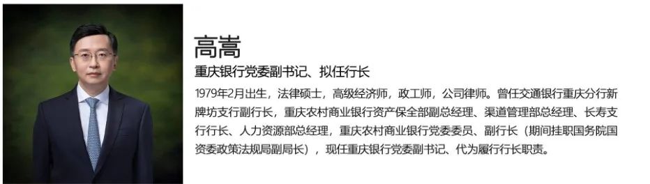 重庆银行建议委任的新执行董事及行长名叫高嵩,44岁,毕业于西南政法大学,法学学士毕业,2005年获得法律硕士学位,为高级经济师、政工师,公司律师,现任该行党委副书记。
