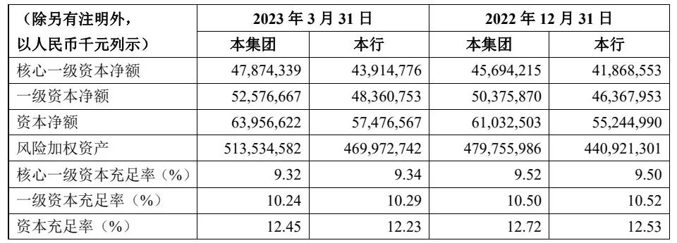资本充足率则从2022年末的12.72%、12.53%分别下降到12.45%、12.23%。
