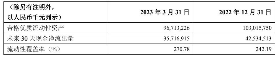 2023年1季度重庆银行的流动性覆盖率270.78%,2022年末还是242.19%。不过这主要“归功”于期内该行未来30天现金净流出量的下滑,合格优质流动性资产相比2022年末则是减少的。