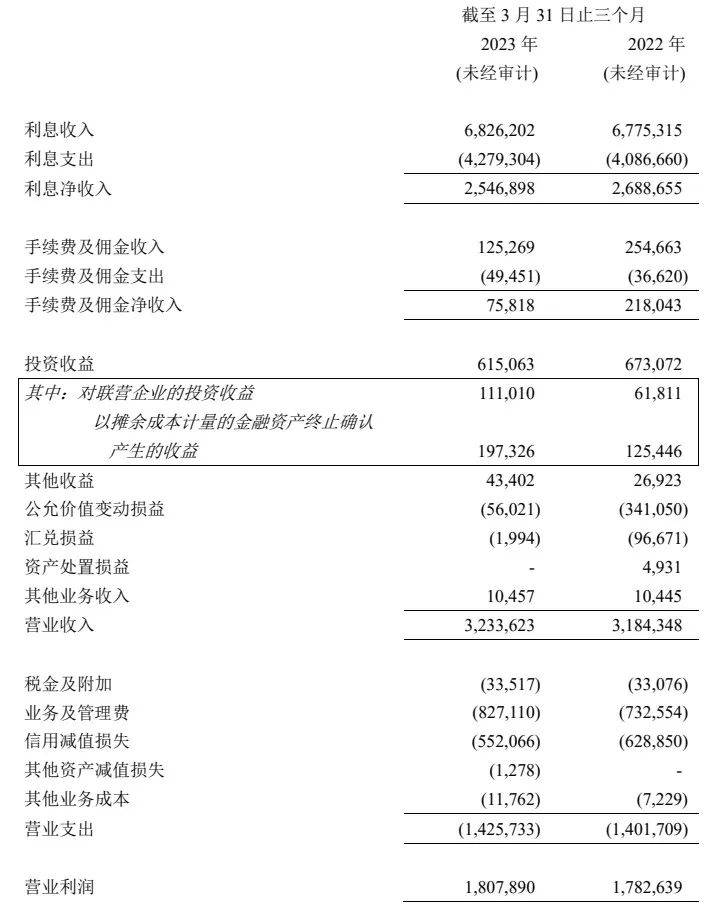 如下图合并利润表显示,重庆银行1季度除利息收入同比微增外,手续费及佣金收入、投资收益同比实际上都在降低。