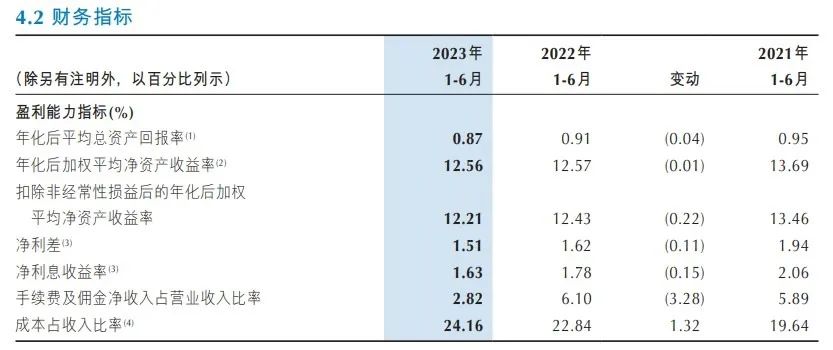 2)年化后加权平均净资产收益率12.56%,2022年同期为12.57%,同比下滑0.01个百分点。2021年同期该数字为13.69%。