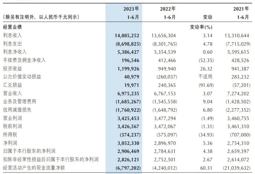 如上,我们看到重庆银行2023上半年,营业利润、税前利润,其实都是小幅下滑的。幸好,归属净利润超29亿元,2022年同期为接近28亿元,同比小幅增长4.38%。2021年同期不到27亿元。