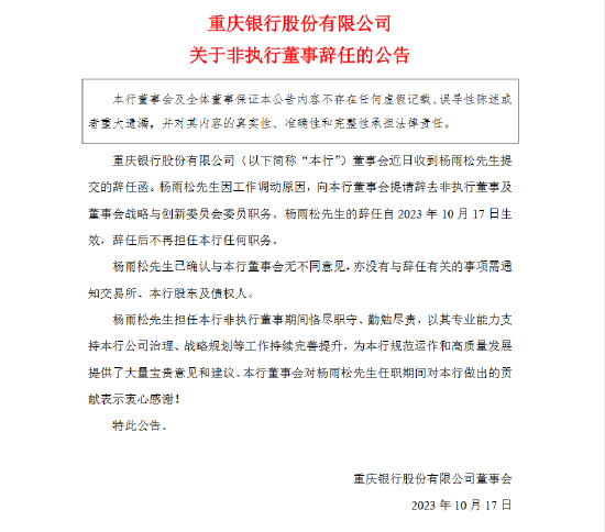 10月17日金融一线消息,重庆银行发布公告,表示董事会近日收到杨雨松提交的辞任函。杨雨松因工作调动原因,向重庆银行董事会提请辞去非执行董事及董事会战略与创新委员会委员职务。杨雨松的辞任自2023年10月17日生效,辞任后不再担任重庆银行任何职务。