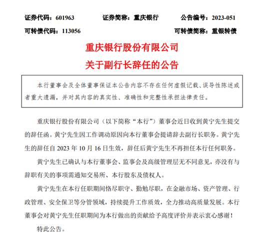 公告显示,黄宁因工作调动原因向该行董事会提请辞去副行长职务。黄宁的辞任自 2023年10月16日生效,辞任后黄宁不再担任行任何职务。