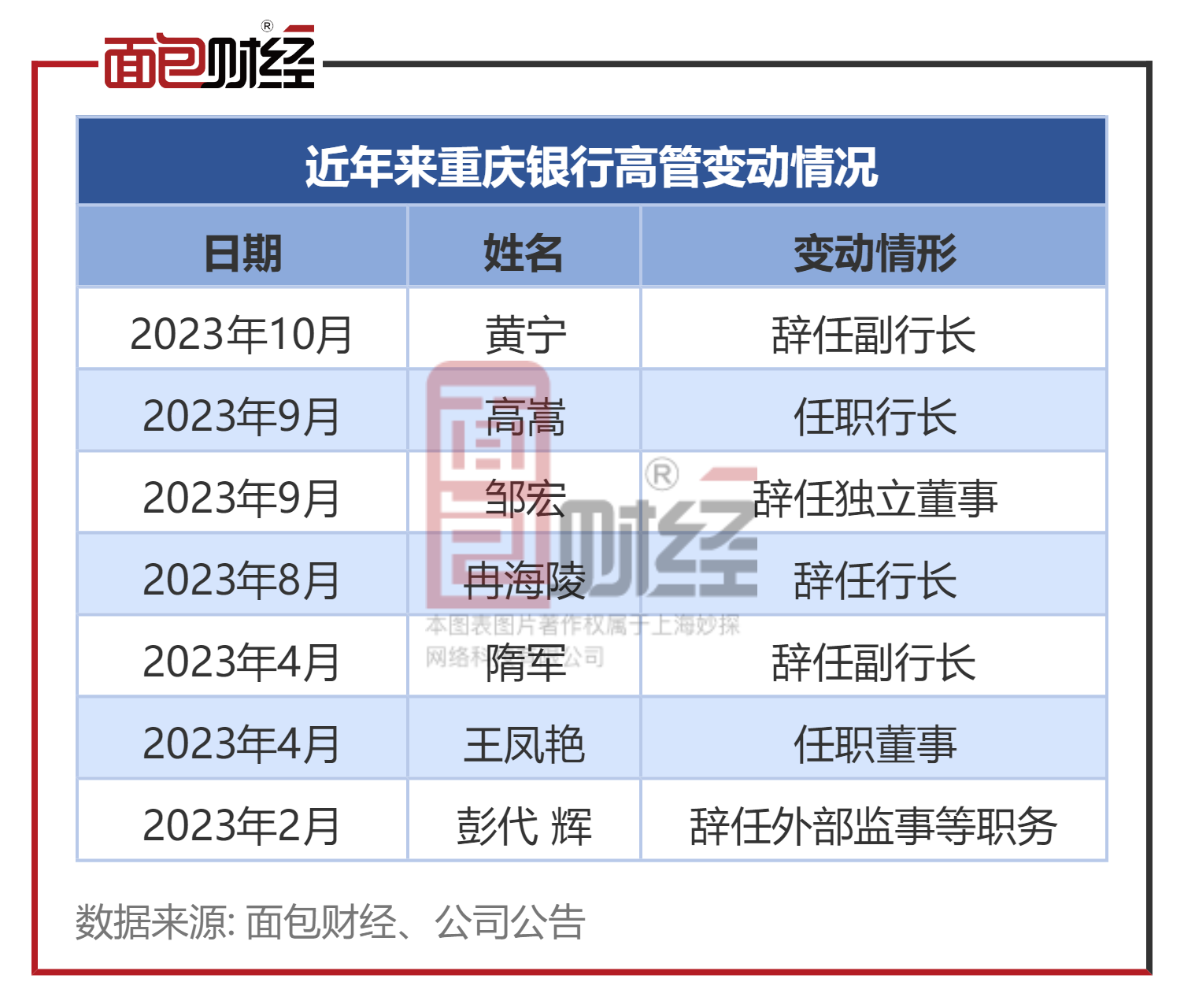 面包财经梳理相关信息发现,2023年以来,重庆银行有多位高管变动,包括副行长在内一系列重要人员的变动。
