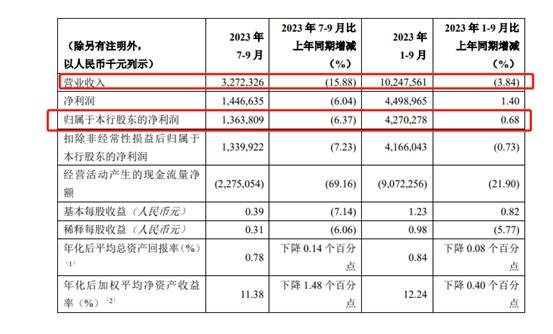 其中,第三季度,该行实现营业收入32.72亿元,同比下降15.88%;实现归母净利润13.64亿元,同比下降6.37%。
