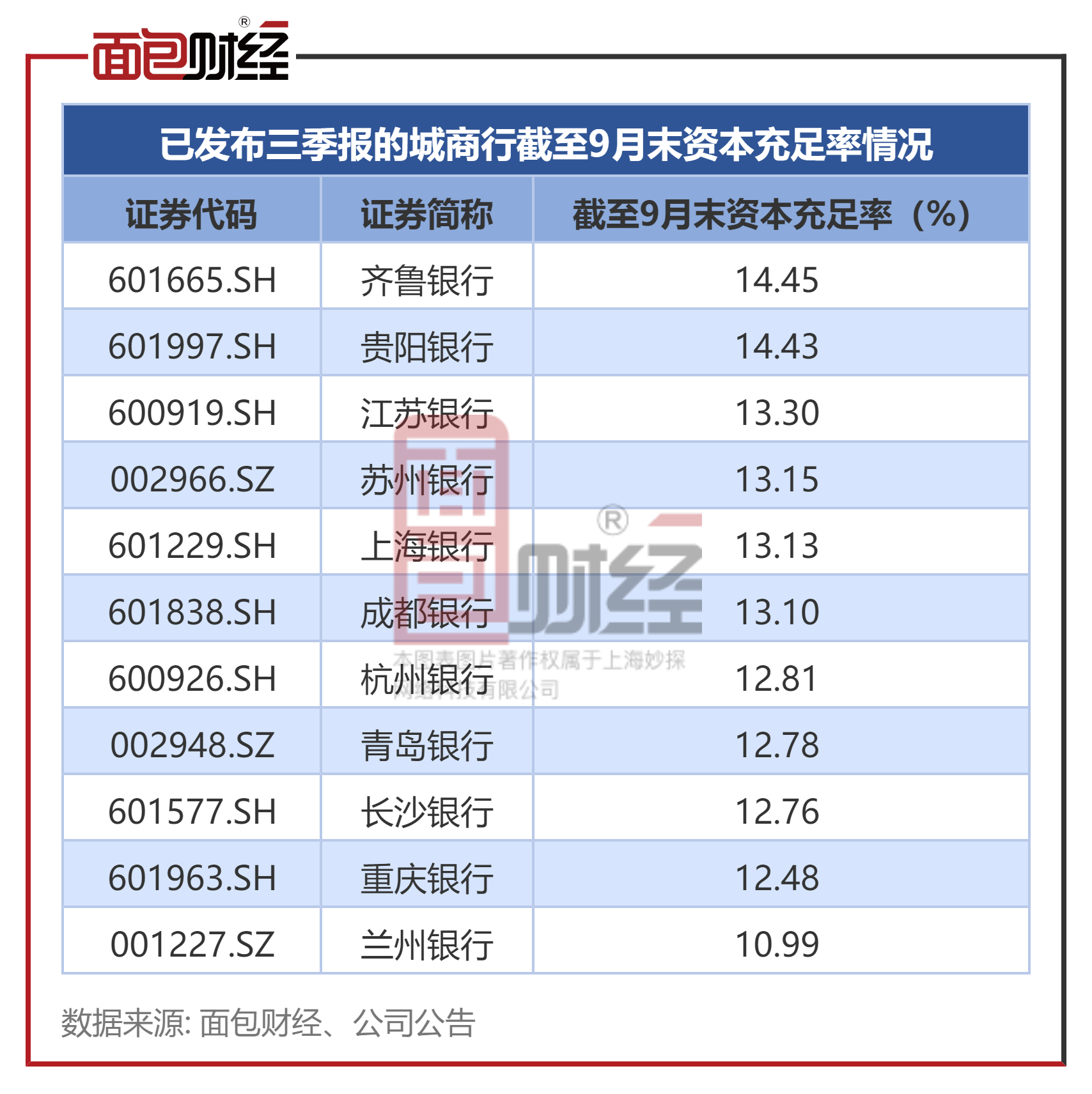 数据显示。截至9月末,该行核心一级资本充足率为9.4%,较上年末下降0.12个百分点;一级资本充足率为10.29%,较上年末下降0.21个百分点;资本充足率为12.48%,较上年末下降0.24个百分点,与其他已发布三季报的上市城商行相比,重庆银行的资本充足率为倒数第二。