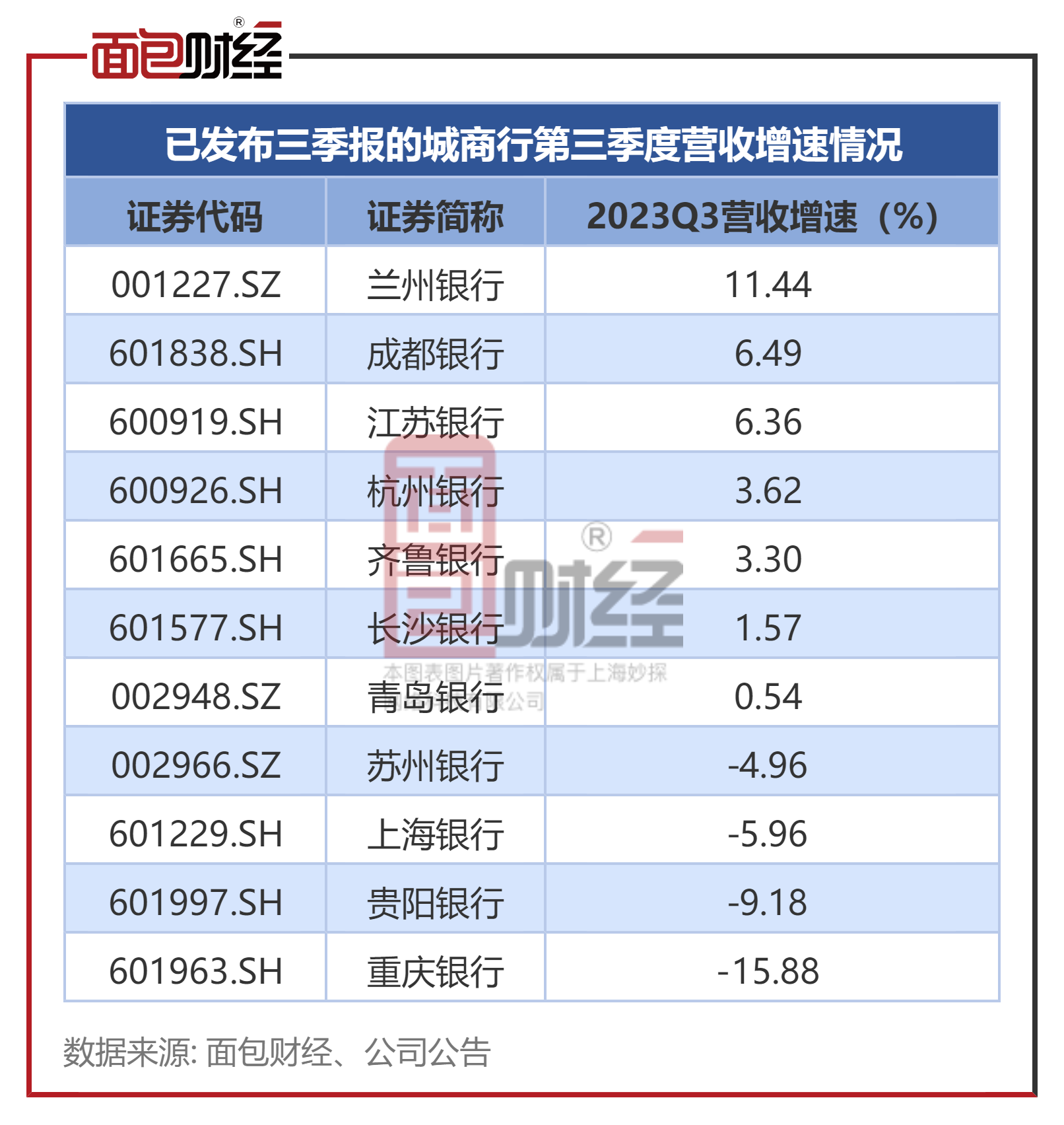 截至目前,已有11家城商行披露三季报。值得关注的是,重庆银行第三季度的营收增速垫底城商行。