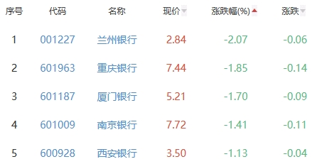 重庆银行跌1.85% 位列银行板块跌幅第二