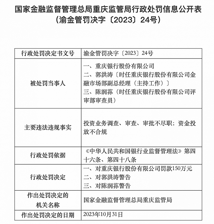 11月9日消息,国家金融监督管理总局重庆监管局行政处罚信息公开表显示,因投资业务调查、审查、审批不尽职,资金投放不合规,重庆银行股份有限公司被罚款150万元,时任重庆银行股份有限公司金融市场部副总经理(主持工作)郭洪涛、时任重庆银行股份有限公司评审部审查员陈润荪分别被警告。