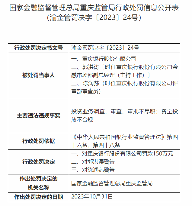 11月9日,国家金融监管总局重庆监管局发布的一则行政处罚信息公开表显示,重庆银行(601963.SH)存在“投资业务调查、审查、审批不尽职;资金投放不合规”的违法违规事实,重庆监管局依据《中华人民共和国银行业监督管理法》第四十六条、第四十八条规定,决定对重庆银行罚款150万元,对责任人郭洪涛、陈润荪作出警告。