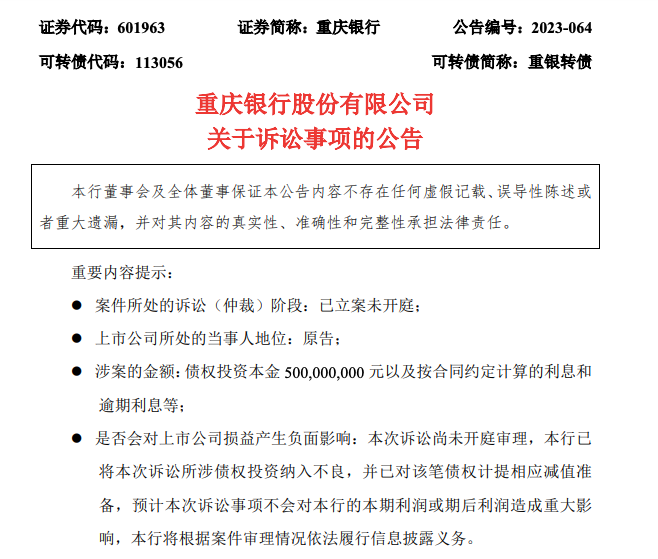 对于此次上述影响,重庆银行公告称,已经按照监管部门及本行内部关于资产风险分类的要求,将上述诉讼所涉债权投资纳入不良,并已对该笔债权计提相应减值准备。